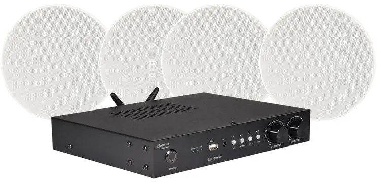 Want wireless audio streaming options? Control your 4 ceiling speakers from an Android or iOS smart phone with freely available apps to stream music and podcasts directly from a WiFi network. This solution is ideal for larger rooms, reception areas, bars and cafes.