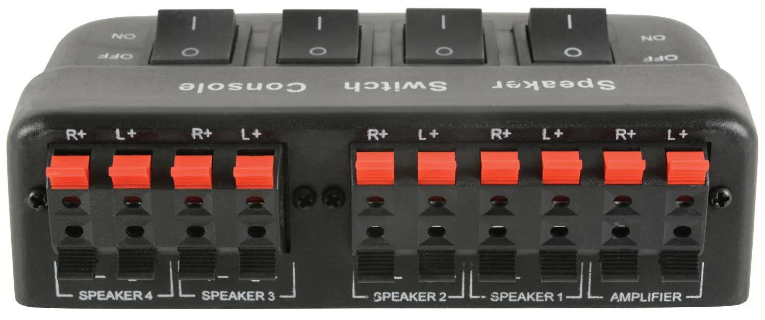 This compact switch allows for two or four pairs of speakers to be connected to a single amplifier, giving the ability to select any pair individually or all together. This can be a quick solution for the zoning of a sound system or for adding extra speakers to a single amplifier.