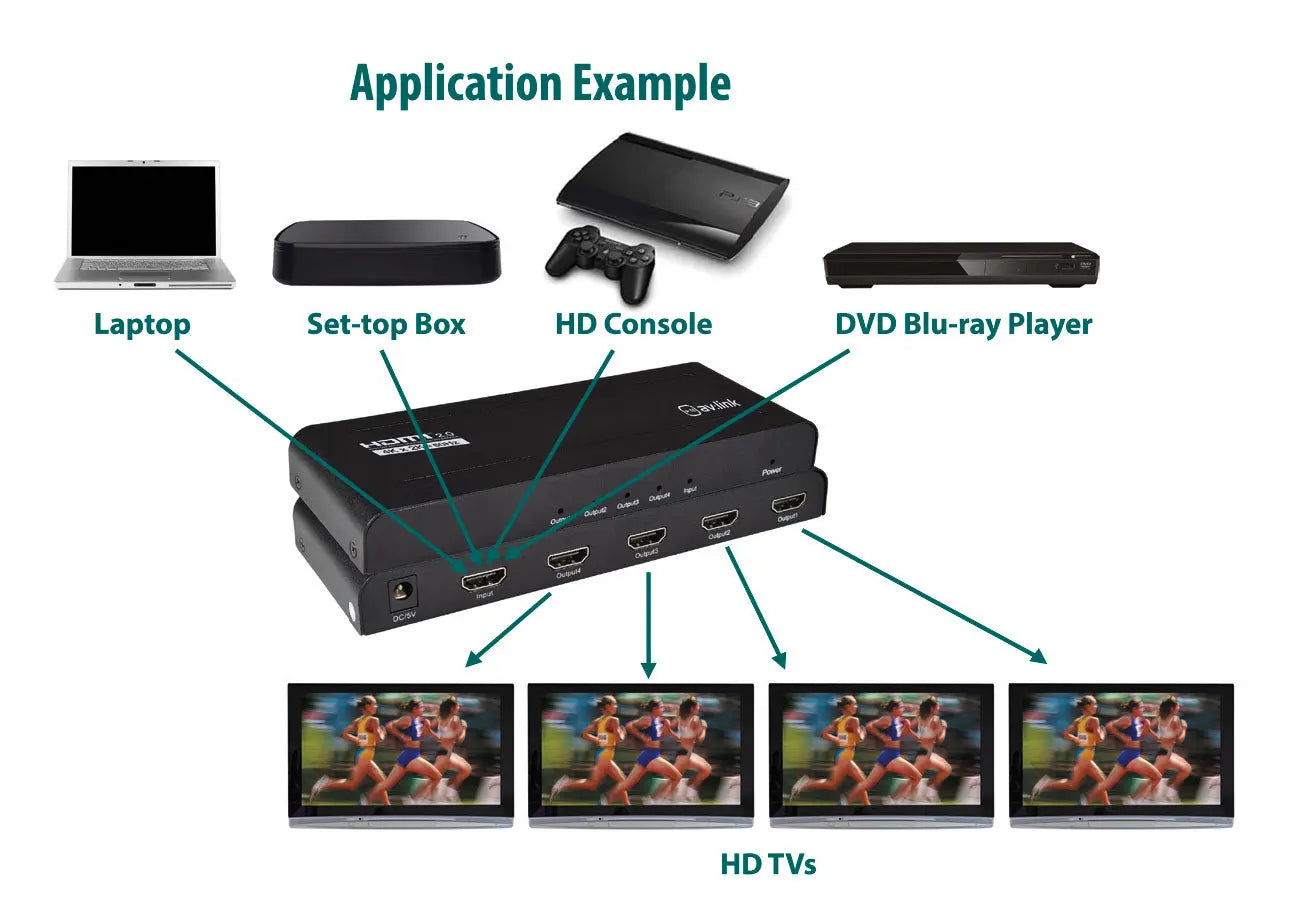 - Ideal for entertainment, hospitality and other commercial venues requiring multiple display feeds from a single HDMI source