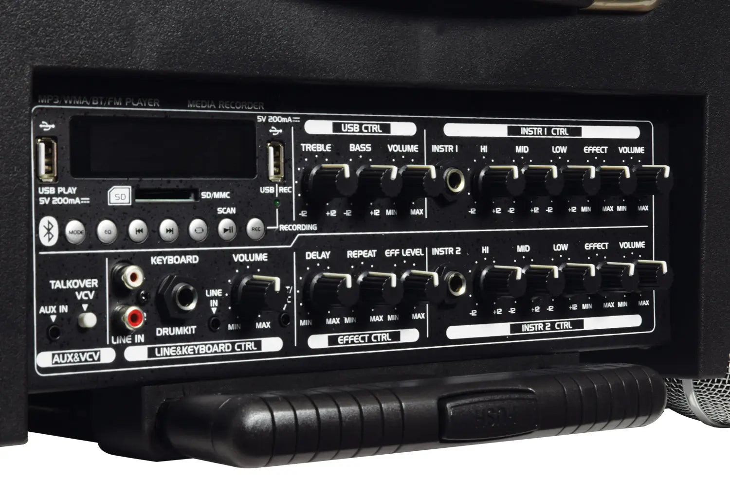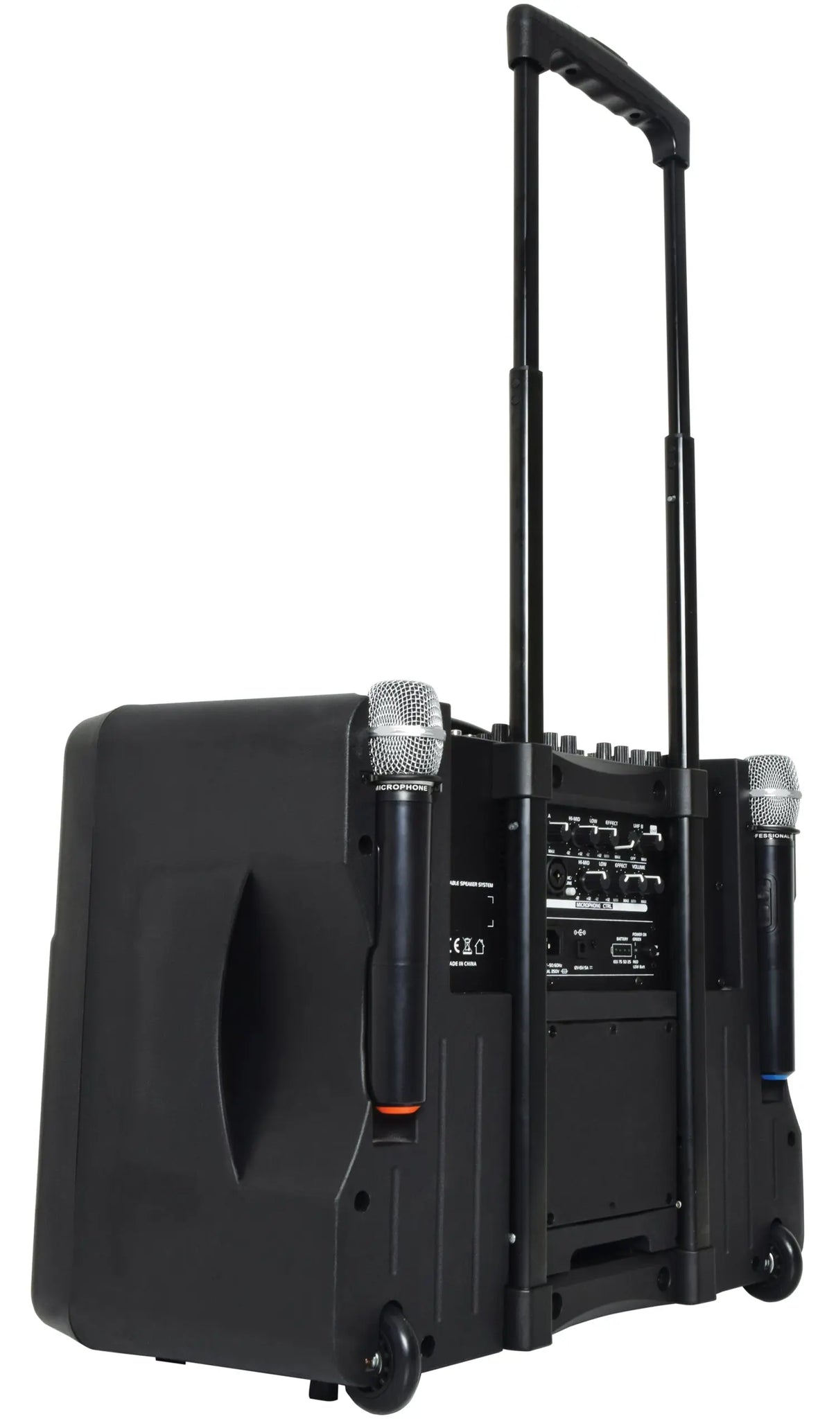 The DELTA-200 is a fully featured portable PA unit in a rugged, injection-moulded combo-style enclosure. Designed with multi-input performances and presentations in mind, the main unit has input channels for 2 instruments, independent Line and Aux inputs, and a separate Mic/Line input channel. In addition, the DELTA-200 system is also supplied with 2 UHF wireless microphones and contains an inbuilt dual receiver with independent controls. A media player section has options for mp3 playback from a USB pen drive or SD card, an FM radio tuner and a Bluetooth receiver for pairing with a smart phone or tablet. The integral 200W amplifier section delivers enough power and bass response for music performances and public address to medium sized audiences. Mains or battery operation and a trolley mechanism for portability give the DELTA-200 freedom and flexibility to provide sound coverage almost anywhere.