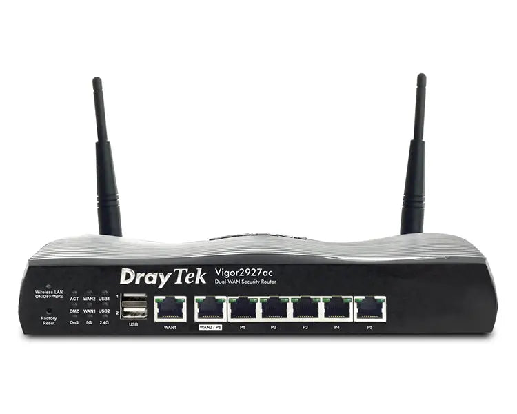 The Draytek Vigor 2927ac is a Dual-Ethernet WAN router featuring VPN, advanced routing features, firewall, content filtering, bandwidth management and more. It offers high throughput with Load Balancing and Failover connectivity, suitable for handling Fibre to the Premises (FTTP) and Gigabit Internet connections. The Vigor 2927 offers up to 950Mbps per-WAN of Hardware Accelerated throughput while retaining its full feature set.