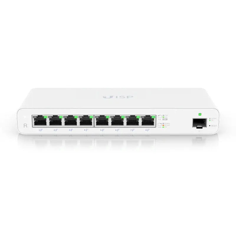 The UISP Router is a fanless PoE router with (8) GbE RJ45 ports and (1) 1G SFP port for an additional fibre uplink option, making it ideal for wireless ISP (WISP) deployments. The Router is a cost-effective routing solution for WISPs looking to deliver Gigabit wireless speeds to their clients rapidly and affordably. The UISP Router provides significant power to every radio in your service network thanks to its large 110W total PoE supply and is controlled by the UISP application, which is a centralised platform for monitoring and managing all of your UISP devices.