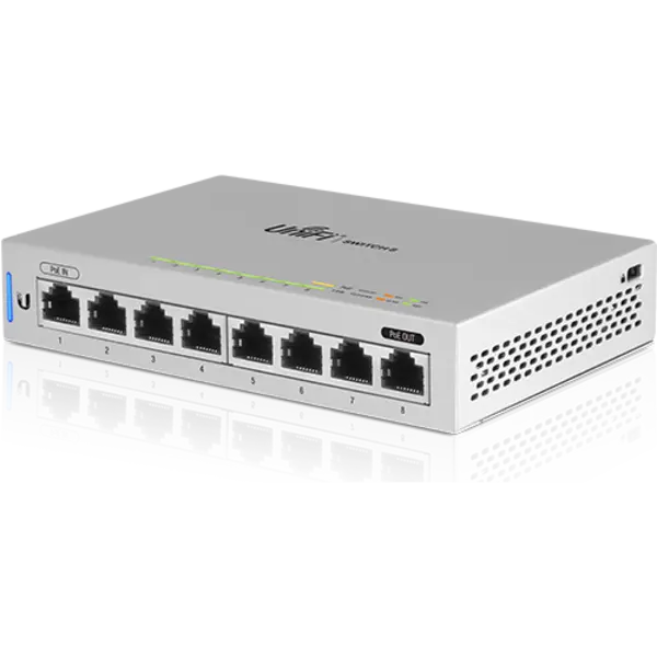 The Ubiquiti UniFi US-8 is a non-PoE 8 port gigabit switch, which supports PoE passthrough. It is perfect for cleanly adding Ethernet ports where needed, all in a compact form factor. Alike the other UniFi Switches, the US-8 is fully manageable, delivering robust performance for your network.