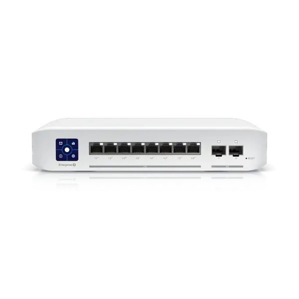 The Ubiquiti UniFi Switch Enterprise 8 PoE is a fully managed, Layer 3 switch with (8) 2.5GbE, 802.3at PoE+ RJ45 ports and (2) 10G SFP+ ports.The USW-Enterprise-8-PoE also features a 1.3" LCM color touchscreen that concisely displays key system and connection insights. This switch can be monitored or configured from anywhere with the powerful, intuitive UniFi Network web application and mobile app.UniFi Switch Enterprise 8 Key Features: