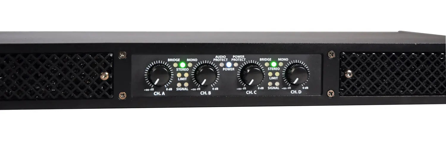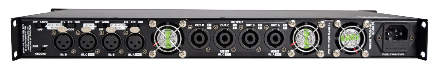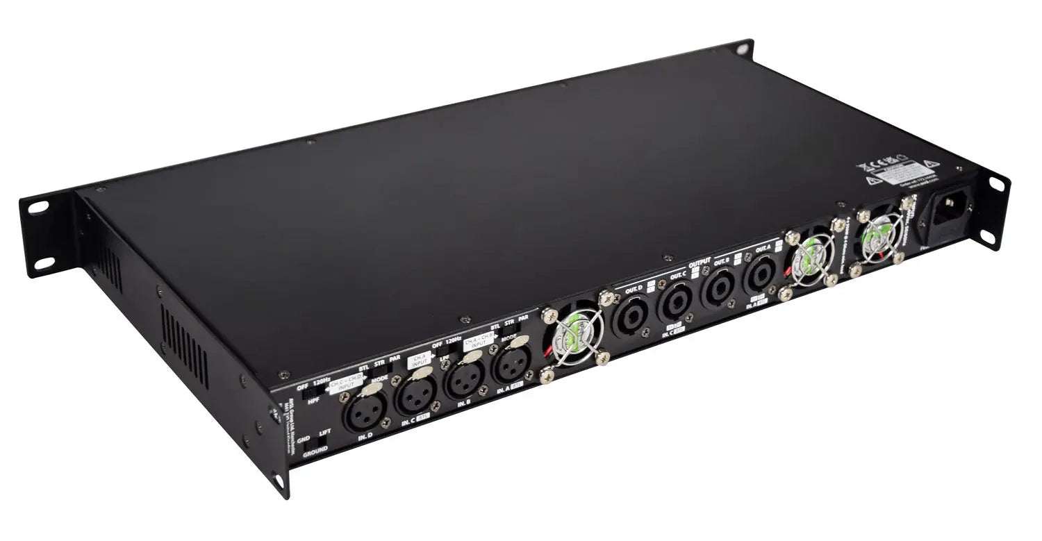 Quad digital power amplifier in a lightweight 1U rack-mountable format. An energy-efficient switch-mode power section and class-D amplifiication circuit delivers accurate power-on-demand to four independent speaker outputs. Proprietary cool guide technology provides stable temperature management for dependable operation. Each pair of output channels can be separately parallel switched or bridged as a full or part stereo amplifier configuration. For channel A, there is a switchable 120Hz low-pass filter for use with subwoofers and a channels C and D have a switchable stereo pair of 120Hz high pass filters to effectively focus power in full-range cabs operating as mid-tops in conjunction with sub-woofers. For permanent or mobile installations, the D-series offers an invaluable and flexible problem solver for audio designers and sound engineers.
