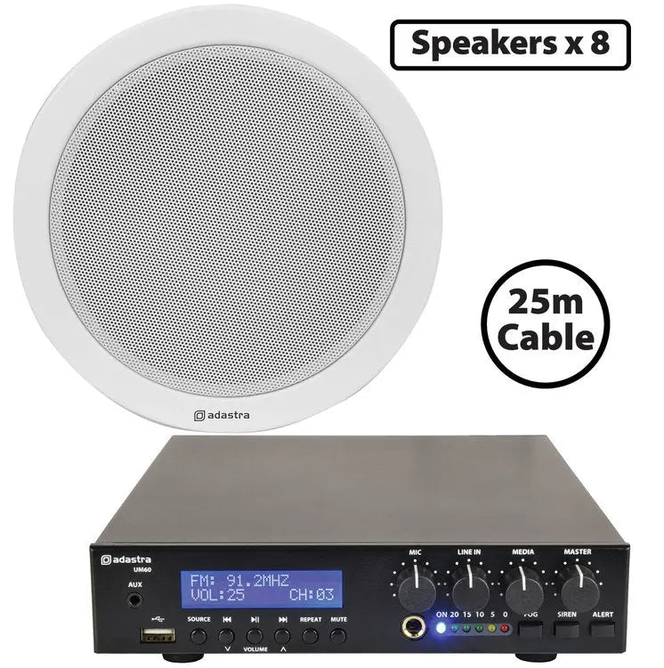 Compact 100V ceiling speaker systems are for background music and announcements in areas with low ceilings and minimal background noise. Available in 3 sizes as a complete kit for an office, retail outlet, workshop or café where there is access to a suspended false ceiling for easy installation. UM series amplifiers have USB, Bluetooth and FM tuner and can be rack mounted in pairs or easily fixed to a wall or under a worktop. Each UM series amplifier also has a 6.3mm jack microphone input and RCA lne input for mp3 player, smartphone, computer etc. The easy-fit 5.25" metal ceiling speakers are suitable for low level background music and announcements. Using lower tappings, more speakers can be addded to the amplifier if total speaker Watts is <90% its max output power.