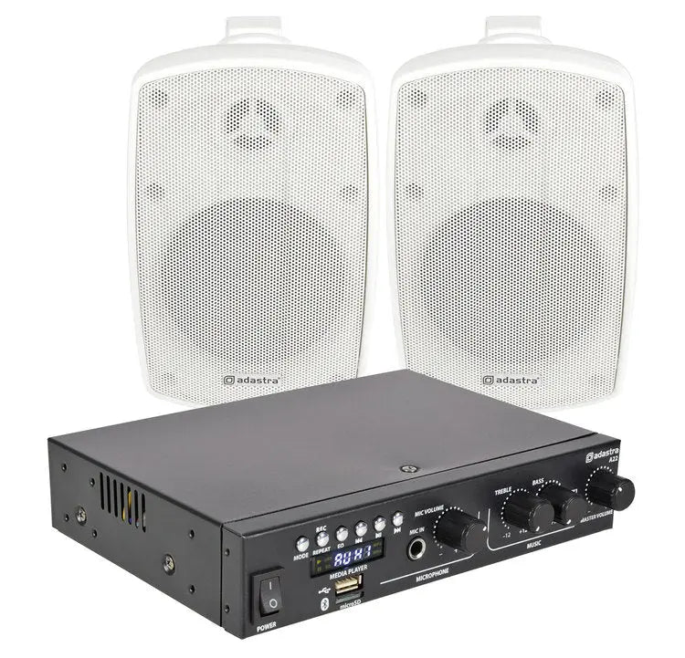 An ideal outdoor, weatherproof audio kit, that is great for smaller spaces. We recommend shops with outdoor areas, cafes, small public spaces.