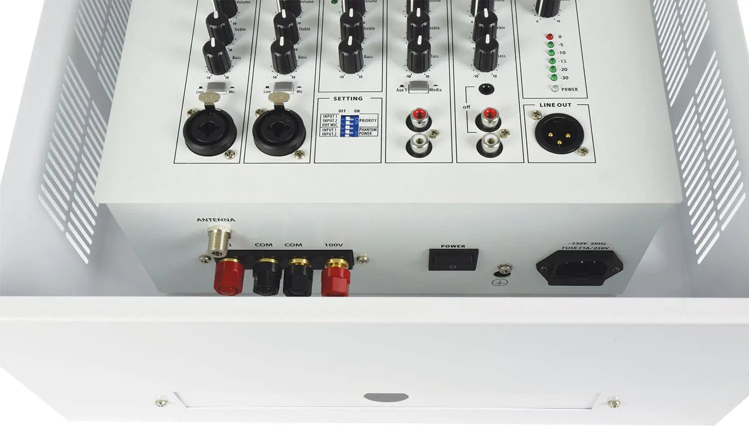 Public address mixer-amplifier built into a surface-mount secure box. A powerful output can drive either 100V line or low impedance speakers from binding post terminals inside the cabinet. The system includes a handheld UHF microphone with an inbuilt receiver and 2 switchable wired mic/line inputs are provided on combo XLR/jack sockets. Each mic input has switchable +48V phantom power and priority override, whch mutes the Aux inputs during voice operation. An internal media player enables playback of audio tracks from USB/SD player, FM tuner or Bluetooth pairing. Alternatively, line inputs can be connected to the Aux 1 RCA sockets or separate Aux 2 RCA/3.5mm jack sockets. The combination of flexible input section and a high efficiency amplifier in a strong, lockable cabinet provides a complete solution for buildings where security and ease of use is essential.