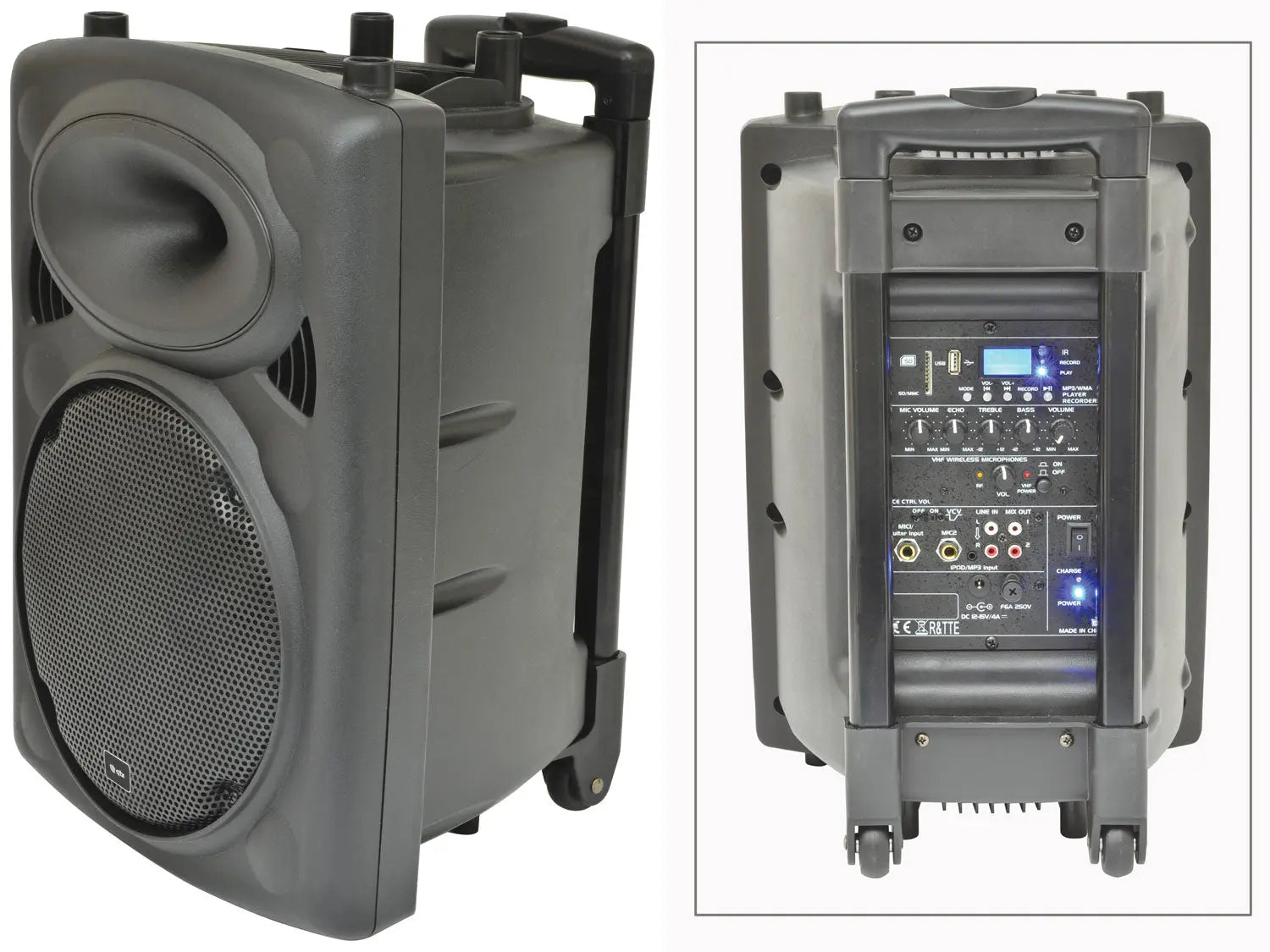 A compact, trolley-style wheeled portable PA unit with a top-mounted retractable pull handle. Versatile input options include a VHF wireless neckband microphone (included), 2 further mic inputs (one can also be used for guitar), mini jack (for phones, tablets, laptops and mp3 players), and RCA in/out (ideal for DJs). An internal media player works directly from SD card or USB memory stick, and a switchable VCV ‘voiceover’ feature automatically lowers the volume of background music when the mic/s are used. A 35mm pole mount enables the unit to be used on a stand. Mains or internal battery power (up to 8 hours).