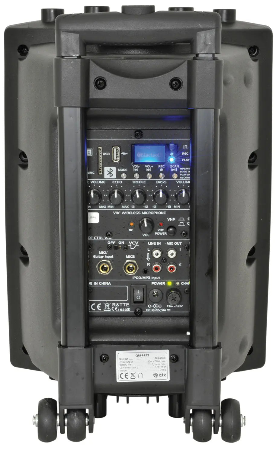 Compact portable PA unit based on the QR speaker cabinet. Built-in amplifier operating from mains or internal rechargeable battery powering a main driver and compression driven horn unit. Two VHF handheld wireless microphones are included (one on 8” and 10” versions) with the receiver built into the mixer/amp section at the rear along with a further two wired mic inputs, auxiliary line input and integral USB/SD/FM media player with record function. A B/T receiver is also built into the media player to enable pairing with a smartphone or tablet for wireless audio playback. A retractable trolley handle and rear wheels provide easy portability.