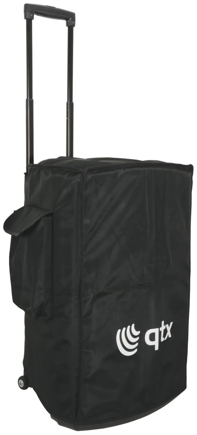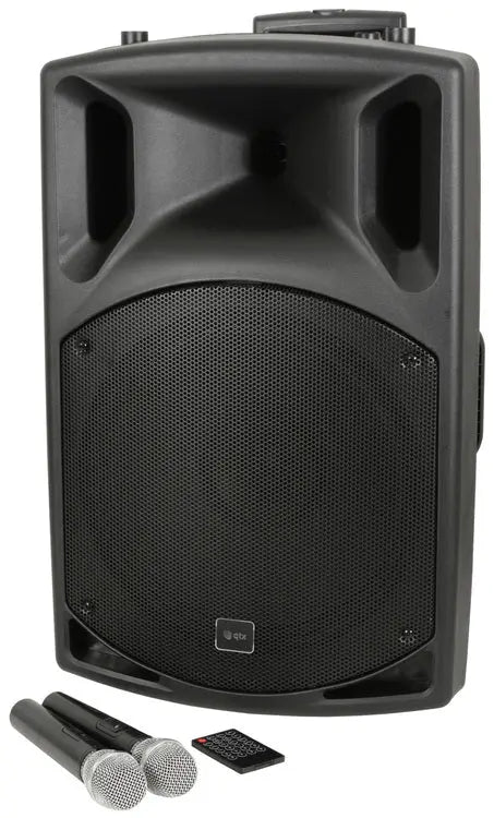 Complete portable PA unit in a QX-series cabinet. Built-in amplifier operating from mains or internal rechargeable battery powering a main driver and compression driven horn unit. 2 x UHF handheld wireless microphones are included with the receiver built into the rear panel along with 2 further mic inputs, auxiliary line input and Bluetooth receiver. Internal audio source is provided by an integral USB/SD/FM media player. A moulded handle and 35mm pole mount are built into the cabinet and a retractable trolley handle and rear wheels provide easy portability.
