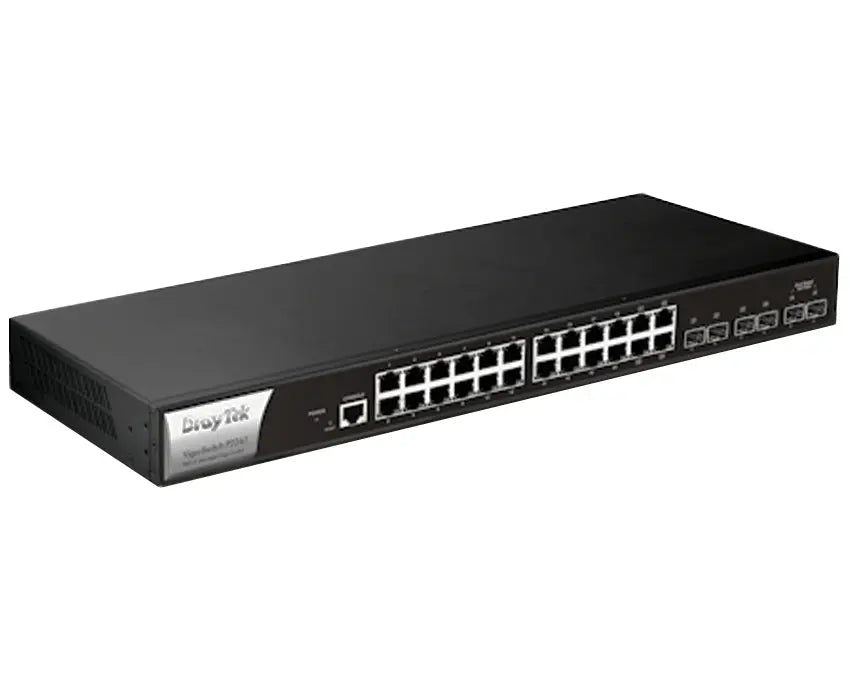 The Draytek VigorSwitch G1280 is designed for small business networks that run various network applications. The 24 Gigabit Ethernet ports and the 4 additional combo Gigabit SFP/RJ-45 ports are perfect for a network with wireless APs, IP phones, and IP surveillance.
