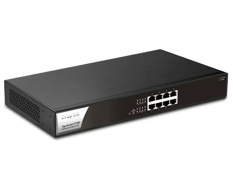 The Draytek VigorSwitch P1085 is a compact Web Smart Gigabit PoE switch. It has 8x Gigabit Ethernet PoE/PoE+ ports with a PoE power budget of 140 watts. The model offers enterprise-level features to help businesses to improve network security and stability.