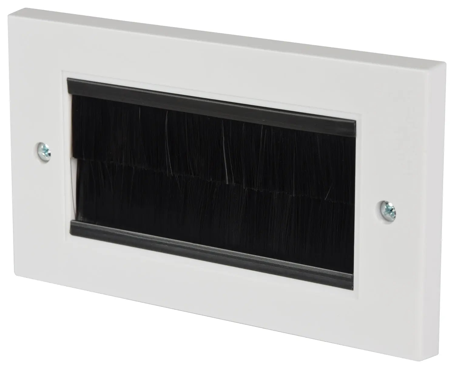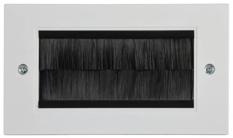 2 gang plastic wallplate with brush filled aperture to allow cable feed-through for AV equipment.
