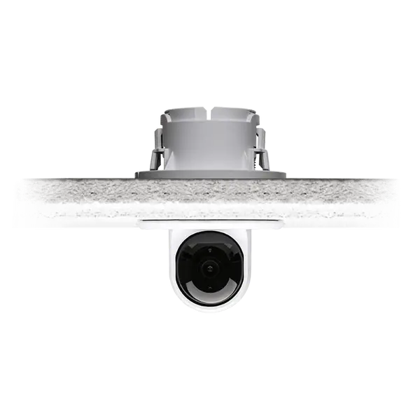 The Ubiquiti UVC-G3-F-C is a recessed ceiling mount accessory for the UVC-G3-FLEX camera. Mount your camera inside the ceiling or a ceiling tile for a clean, low-profile installation. Ubiquiti UVC-G3-F-C includes mounting hardware for drywall, solid surface, or ceiling tile installation. Optional security screw locks the camera to the mount from above for added security.